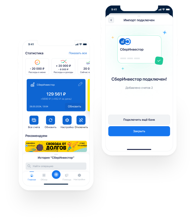 Вы можете подключить до 2-х брокерских счетов в CoinKeeper, и ваш портфели из Snowball Income будут отображаться как счета в CoinKeeper. Вы увидите актуальный баланс ваших портфелей, а также текущую доходность.